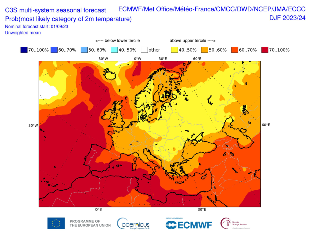 Its data signal a more than 50% likelihood of temperatures significantly above average in the UK, France, Austria, Italy and parts of Germany between December and February. There’s even greater probability of mild weather on the Iberian peninsula.