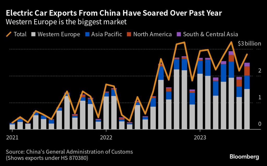 (Bloomberg) — The number of Chinese-made electric cars going to Europe has soared in recent months, prompting the European Union to earlier this week announce an investigation into whether those vehicles are being unfairly subsidized.