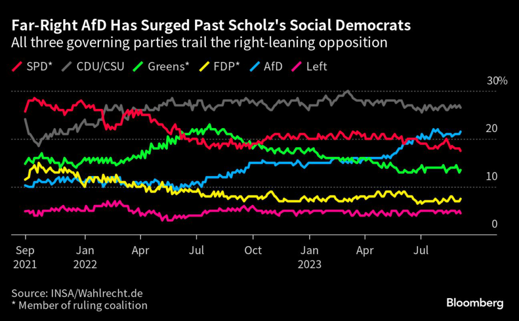 At the same time, Scholz and his Greens and FDP coalition partners have been hamstrung by infighting and are struggling to convince voters that they can successfully manage Germany’s transition to a more climate-friendly and technologically advanced economy.