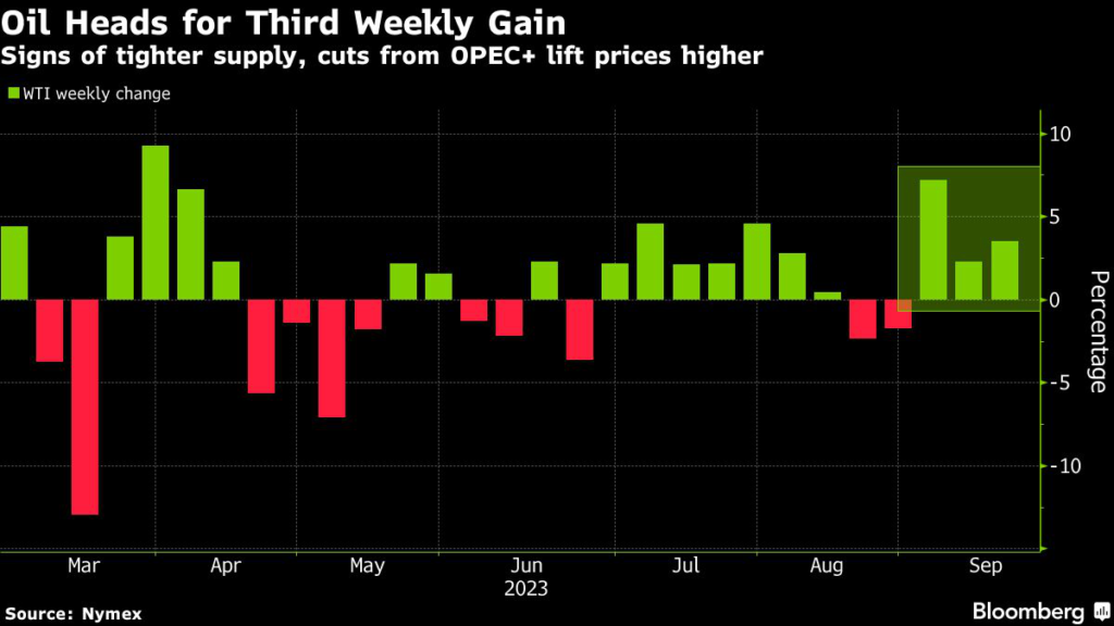 (Bloomberg) — Oil rose for the third straight week as the market continued to tighten on the back of production cuts from Saudi Arabia and Russia.