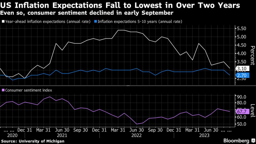 (Bloomberg) — US inflation expectations fell in early September to the lowest levels in more than two years as consumers grew more optimistic about the economic outlook.