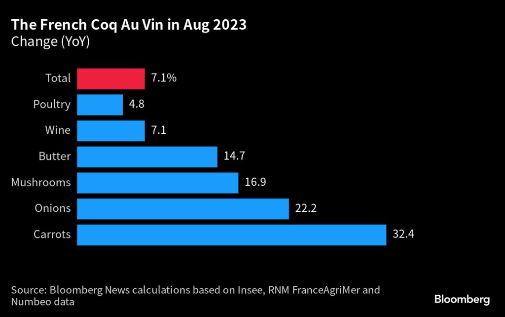 Bloomberg’s Coq au Vin custom index, which calculates how much French families need to spend on the ingredients needed to cook the poultry dish, was up 7.1% in August from a year earlier.