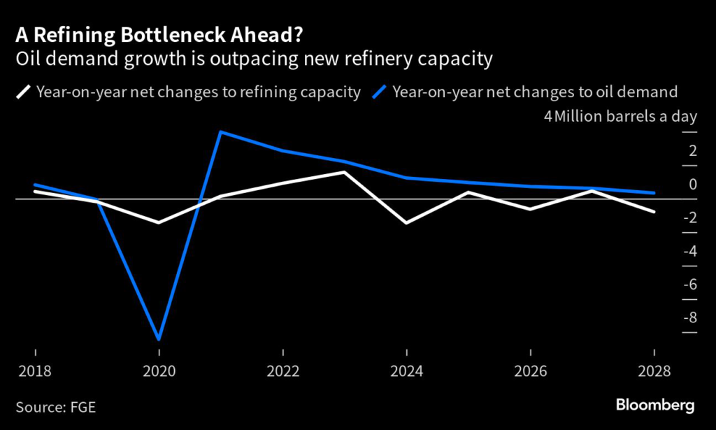 After 2028, there are no confirmed new refinery projects, it said, though there will likely be projects undertaken in Asia and the Middle East.