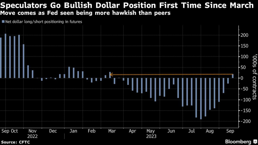 (Bloomberg) — Hedge funds have turned bullish on the dollar for the first time since March as speculation builds that Federal Reserve policymakers will retain a hawkish bias when they meet this week.