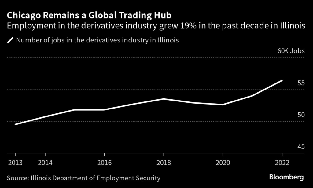 The derivatives industry now employs some 58,800 people in Illinois, expanding 19% over the past decade. That trounces the state’s overall employment growth of 5.9% in that span.