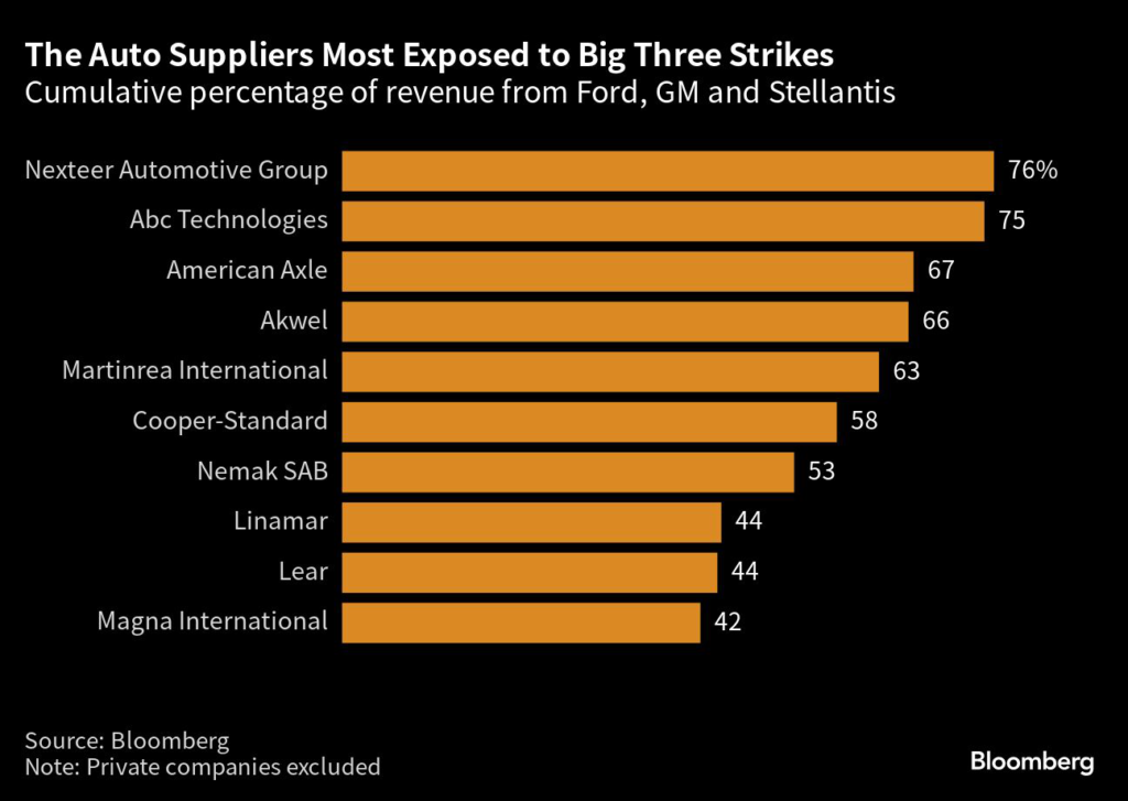 (Bloomberg) — Auto-parts makers that supply all three of the big Detroit carmakers have more than $38 billion of revenue at risk if strikes by the United Auto Workers expand as threatened.