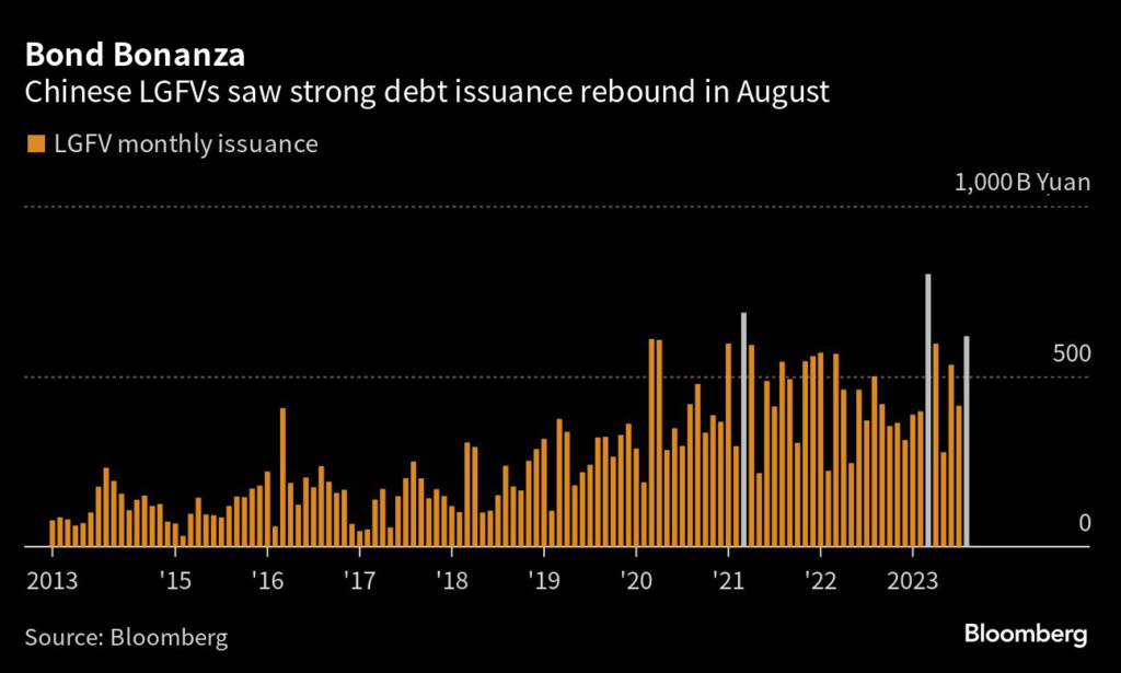Domestic bond issuance by LGFVs, which are typically tasked to build infrastructure projects, reached nearly 620 billion yuan ($85 billion) in August, an almost 50% jump from July and the third-highest monthly tally on record, Bloomberg-compiled data show.