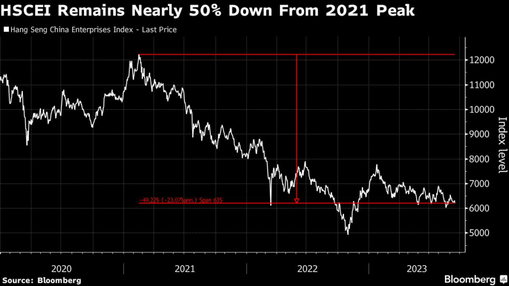 The HSCEI has plunged nearly 50% from early 2021, given China’s lackluster economy, its tensions with the West and a crisis engulfing its property sector.