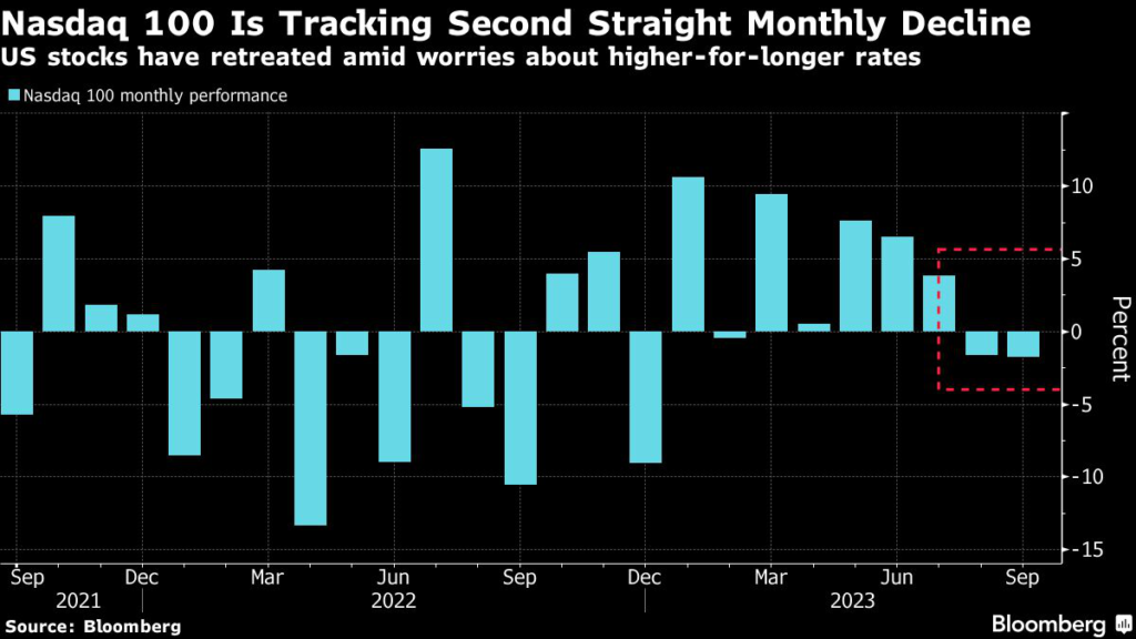 After leading the rally in US stocks earlier this year amid a buzz around artificial intelligence, the Nasdaq 100 has retreated since late July as investors again worry about the possibility of interest rates staying higher-for-longer.