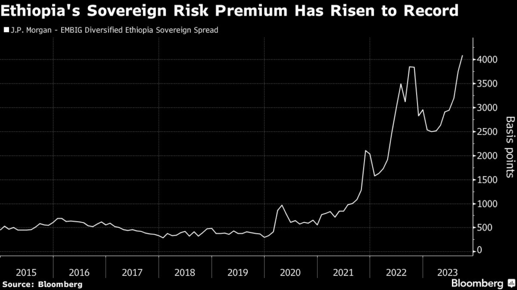 The extra yield investors demand to own Ethiopia’s dollar debt has widened to a spread of 4,089 basis points over Treasuries, according to JPMorgan Chase & Co.