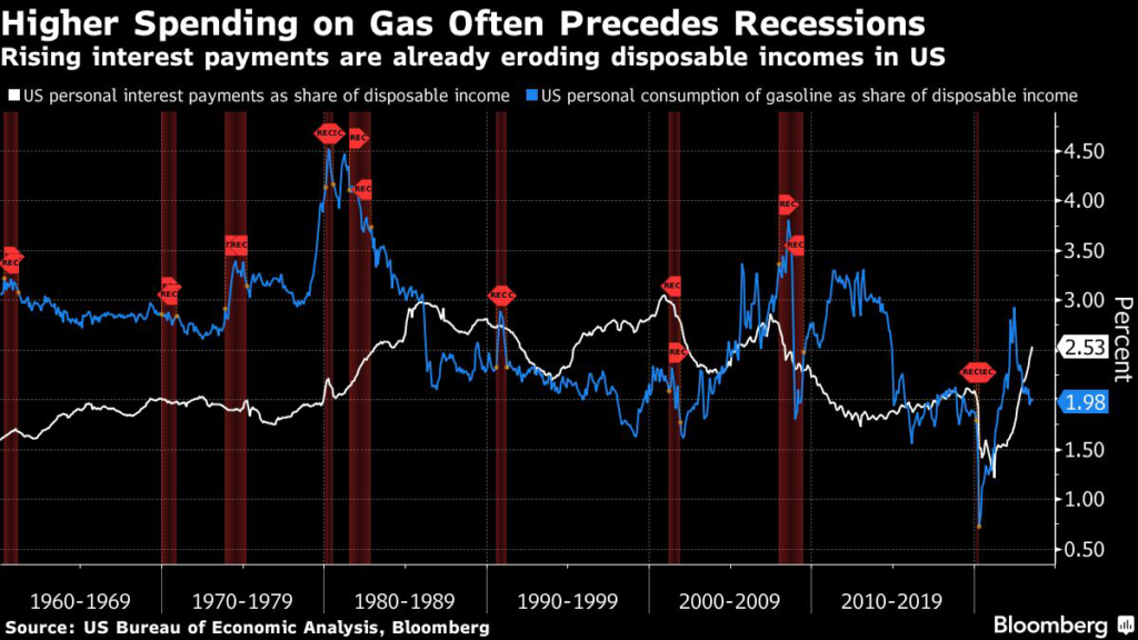 Meanwhile, the rise in oil prices adds to a growing list of emerging headwinds to economic growth, with consumer balance sheets showing incipient signs of strain as interest payments eat up a bigger share of expenditures.