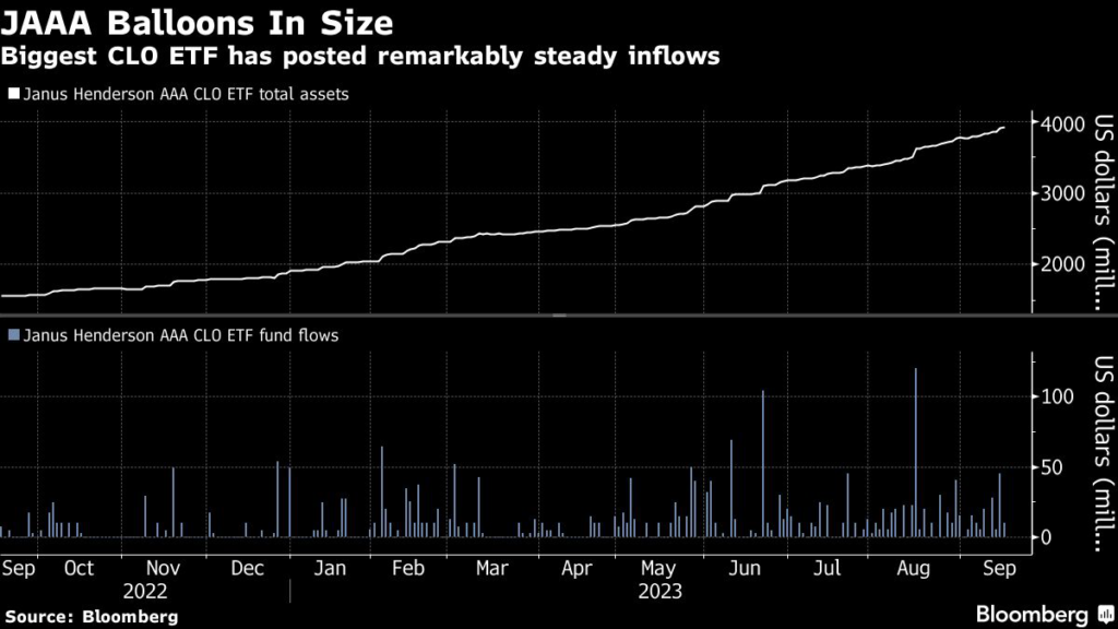 The Janus Henderson AAA CLO exchange-traded fund (ticker JAAA) has ballooned to a record $3.9 billion in assets since its October 2020 launch, dwarfing at least nine other CLO-focused funds.