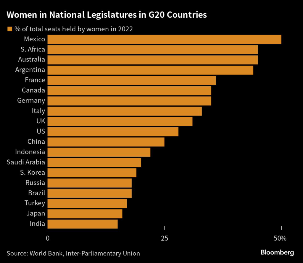 But representation in parliament is the lowest in the Group of 20 economies, at 15%.
