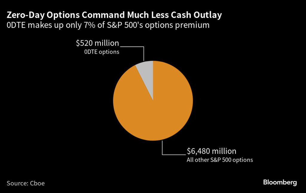While the notional volume of 0DTE now represents 44% of all options-related trading on the S&P 500, per Cboe data, the amount of money charged for them accounts for just 7% of the total outlay for contracts tied to the index.