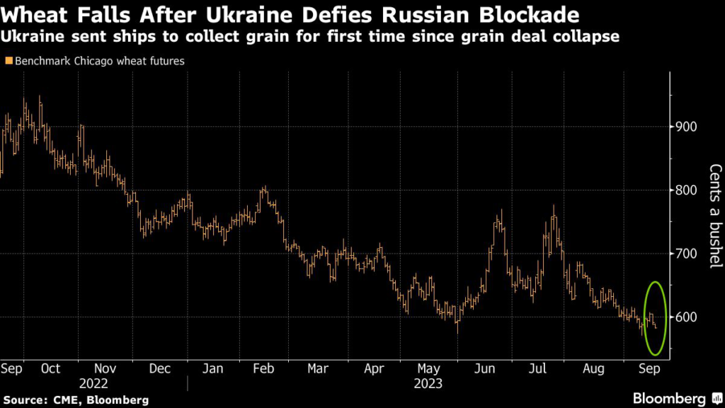 Wheat extended losses after a first grain-laden vessel left Ukraine’s port of Chornomorsk, as Kyiv seeks to defy Russia’s effective blockade of its Black Sea facilities since the collapse of a safe-passage deal in July.