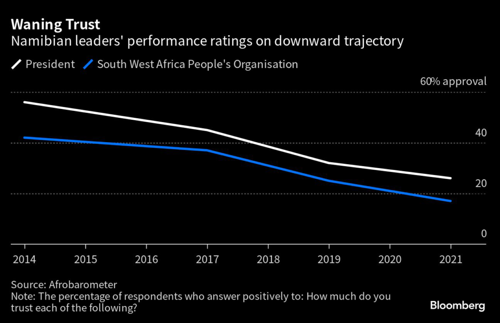 The government’s popularity has slid, with trust in President Hage Geingob plummeting from more than half to a quarter in the seven years to 2021, according to an Afrobarometer study.