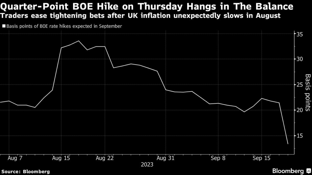 Money markets are now betting the BOE’s most aggressive string of rate increases in three decades is drawing to a close, with just one more hike to 5.5% priced by early next year.