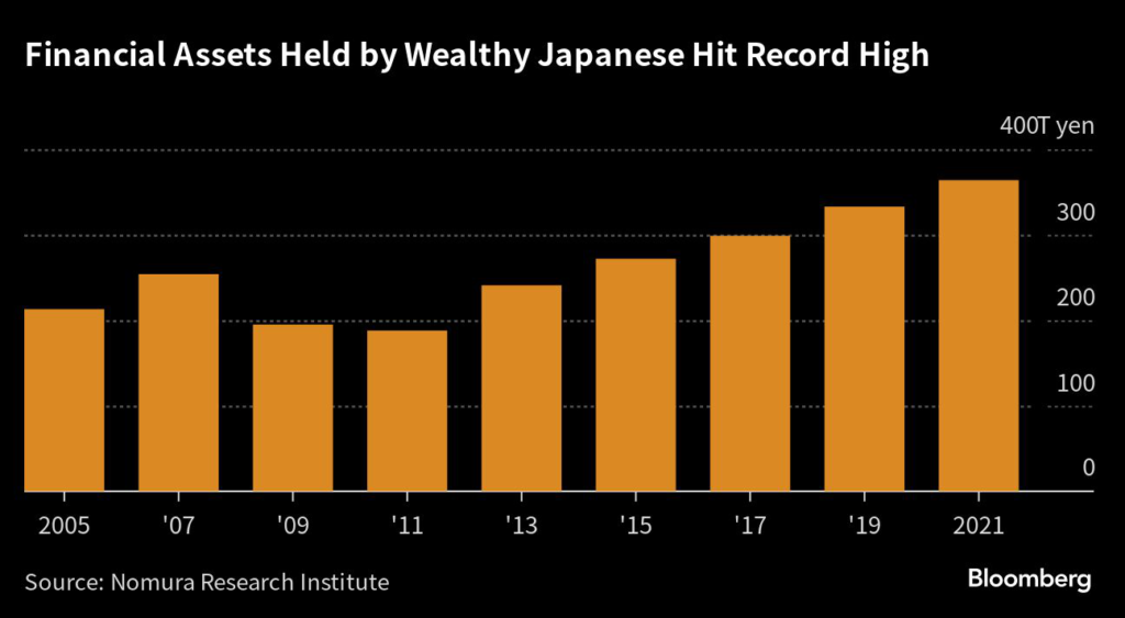 Wealthy Japanese households owned an unprecedented 364 trillion yen of financial assets that nearly doubled in the decade to 2021, according to data from Nomura Research Institute. It defines owning at least 100 million yen in financial assets as wealthy, and the number of households in that category jumped 84% over that period to a record 1.49 million.