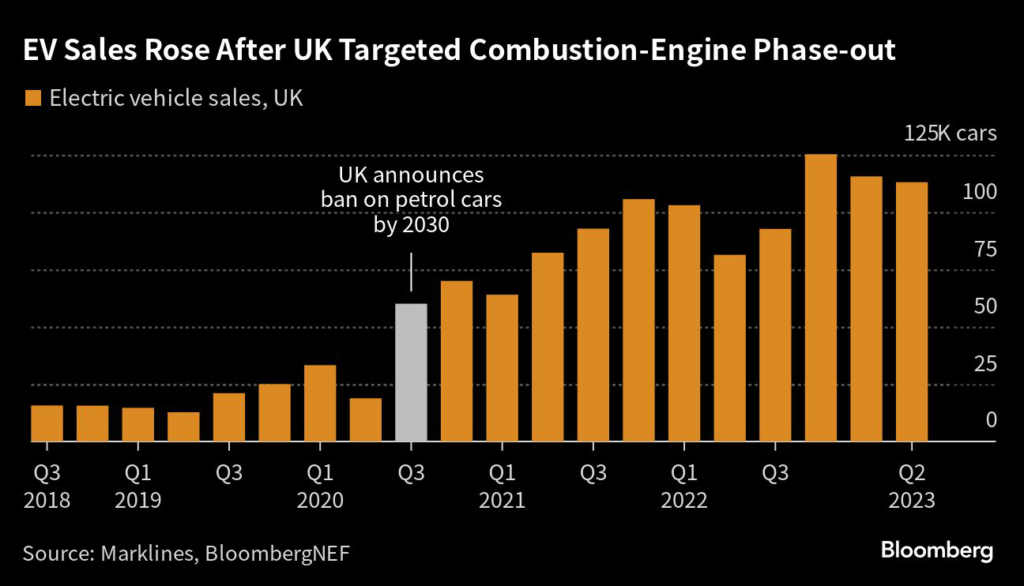 Prime Minister Rishi Sunak is considering rolling back some green-energy policies to help consumers weather a cost-of-living crisis. The potential measures, which could include a five year delay to the planned 2030 ban on petrol and diesel car sales, risk pushing off course Britain’s broader plan to reach net-zero by mid-century.