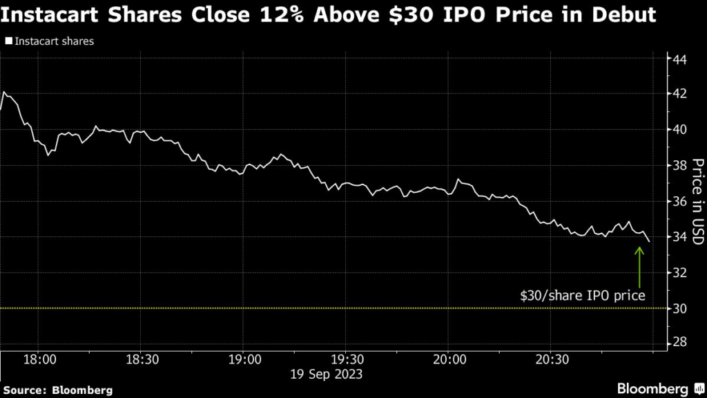 (Bloomberg) — Instacart, the US grocery-delivery giant that soared by as much as 43% in its trading debut Tuesday, has now wiped out virtually all of those gains as investors question its growth prospects.