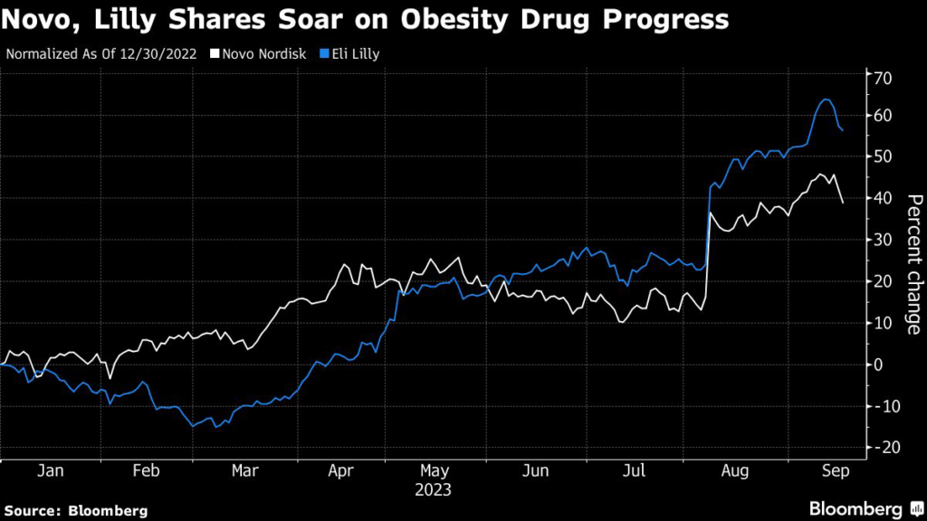 Novo has jumped 38% this year amid a boom in demand for its Wegovy and Ozempic injectable drugs. Meanwhile, Eli Lilly shot up 57% in anticipation of an expected US approval to use its Mounjaro diabetes medicine to treat obesity.