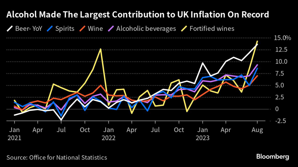 (Bloomberg) — An increase in alcohol duty added to inflation in August, undercutting Chancellor of the Exchequer Jeremy Hunt’s vow that he would do “everything we can” to get the cost of living under control.