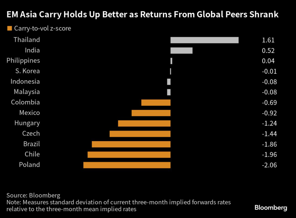 (Bloomberg) — Emerging Asian currencies have been less attractive than most of their global peers as carry-trade targets over the past year but they are now catching up.