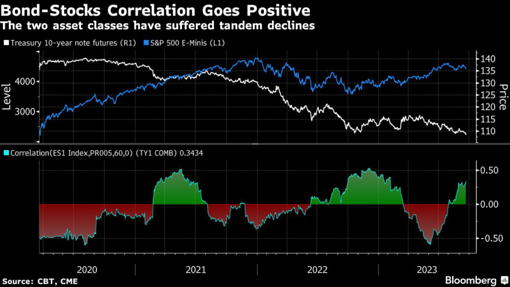 A benchmark for the 60/40 model has dropped nearly 2% so far in September. With the 60-day correlation between the S&P 500 and benchmark Treasuries having climbed to the highest level since February, the increasing lockstep moves calls into question the role of fixed income as a hedge when riskier assets slump.