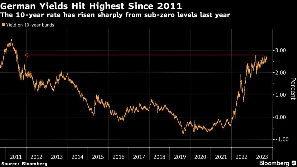 German bonds tumbled to send the government’s benchmark borrowing costs to the highest in over a decade, as investors bet on European interest rates remaining elevated for longer.