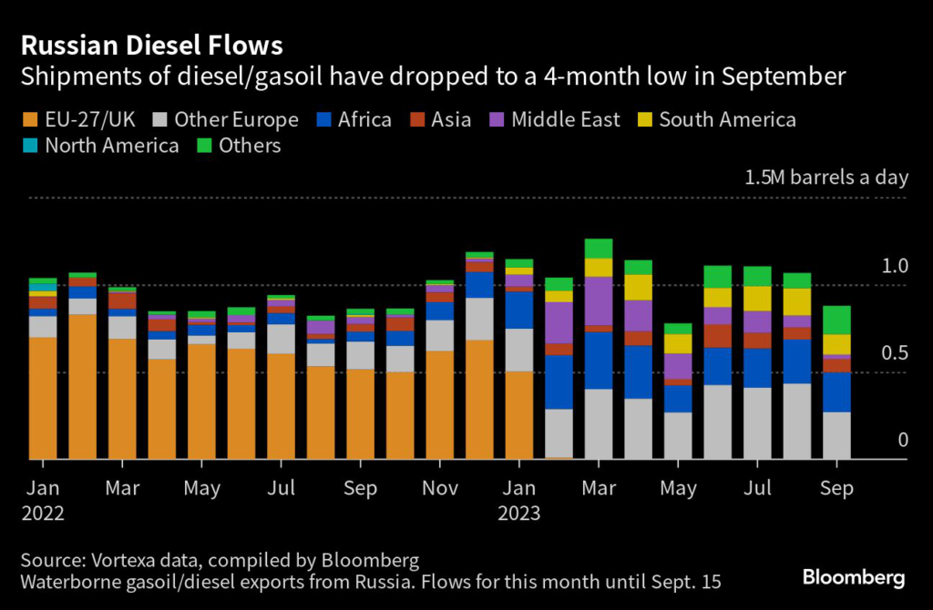 (Bloomberg) — Russia’s decision to ban exports of diesel — and gasoline — risks disrupting fuel supplies ahead of winter, but how deep the impact will be depends on how long it lasts.