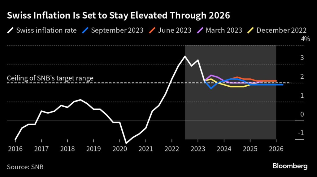 In new estimates, the SNB projected inflation of 2.2% in 2023 and 2024, and 1.9% in 2025. That compares with prior forecasts for 2.2% this year and next, and 2.1% after that.