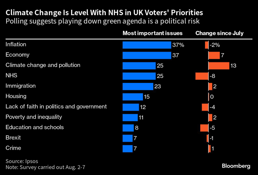 Rishi Sunak’s decision to water down a key part of the UK’s green agenda represents a gamble that conceding some ground to the climate-skeptic political right will appeal to Britons buffeted by a cost-of-living crisis.