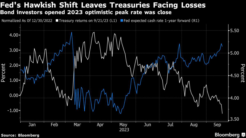 (Bloomberg) — Treasury 10-year yields rose above 4.5% for the first time since 2007 as a more hawkish Federal Reserve adds to concern the bonds face a toxic mix of large US fiscal deficits and persistent inflation.