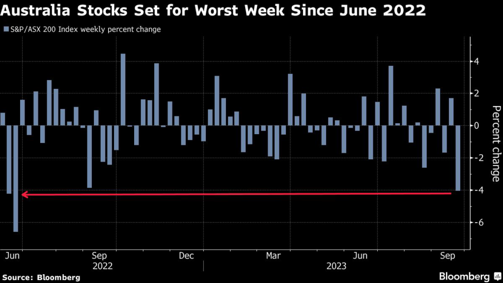 (Bloomberg) — Australian stocks were on track for the worst week since June 2022 on concerns that the nation’s central bank may further raise rates.