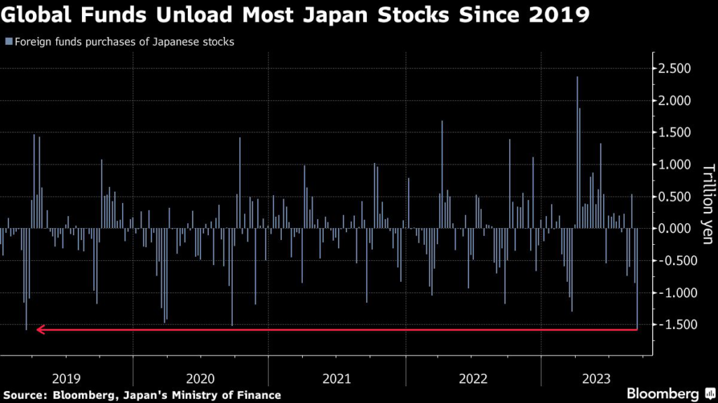 (Bloomberg) — Foreign investors sold the most Japanese equities since March 2019 last week as the Topix index reached a fresh multi-decade high.
