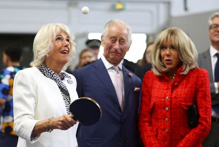 * Camilla and Macron’s wife Brigitte played table tennis together at a sports centre outside of Paris – not that successfully.