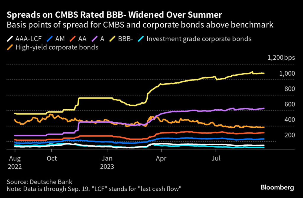 (Bloomberg) — Spreads on lower-rated commercial mortgage-backed securities widened over the summer as traditional buyers of the debt wait for more clarity on the outlook for interest rates and office valuations.