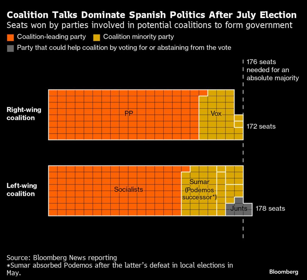 (Bloomberg) — Even Spain’s center-right opposition leader, Alberto Nunez Feijoo, doesn’t seem to think he’ll garner enough votes in parliament next week to allow him to become prime minister and oust Socialist leader Pedro Sanchez.