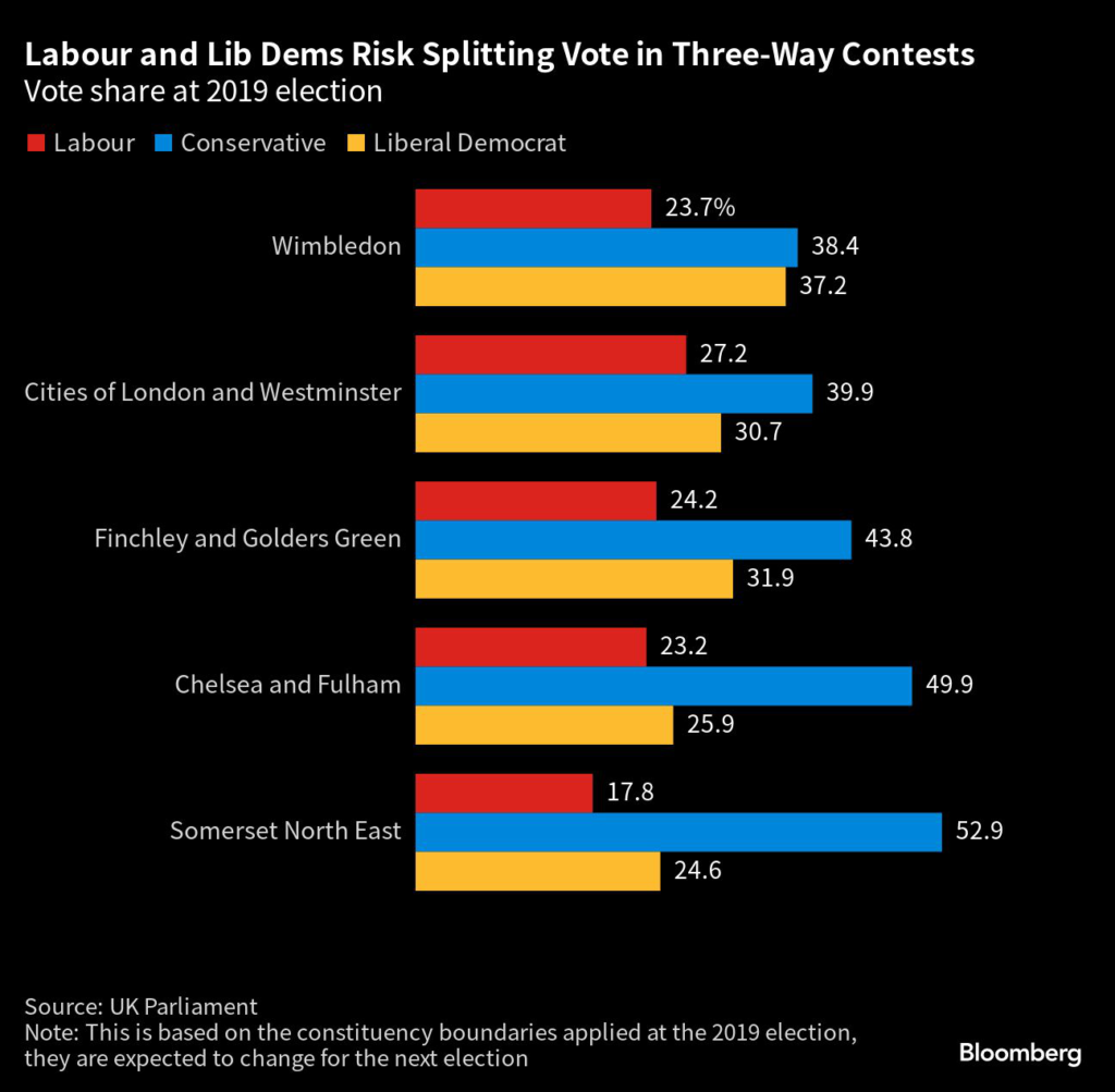 The issue is apparent in the upcoming by-election in Mid Bedfordshire, where Labour and the Lib Dems are campaigning aggressively against one another in a three-way race with the Conservatives. Under Britain’s first-past-the-post voting system, the party with the most votes in a district wins the seat.