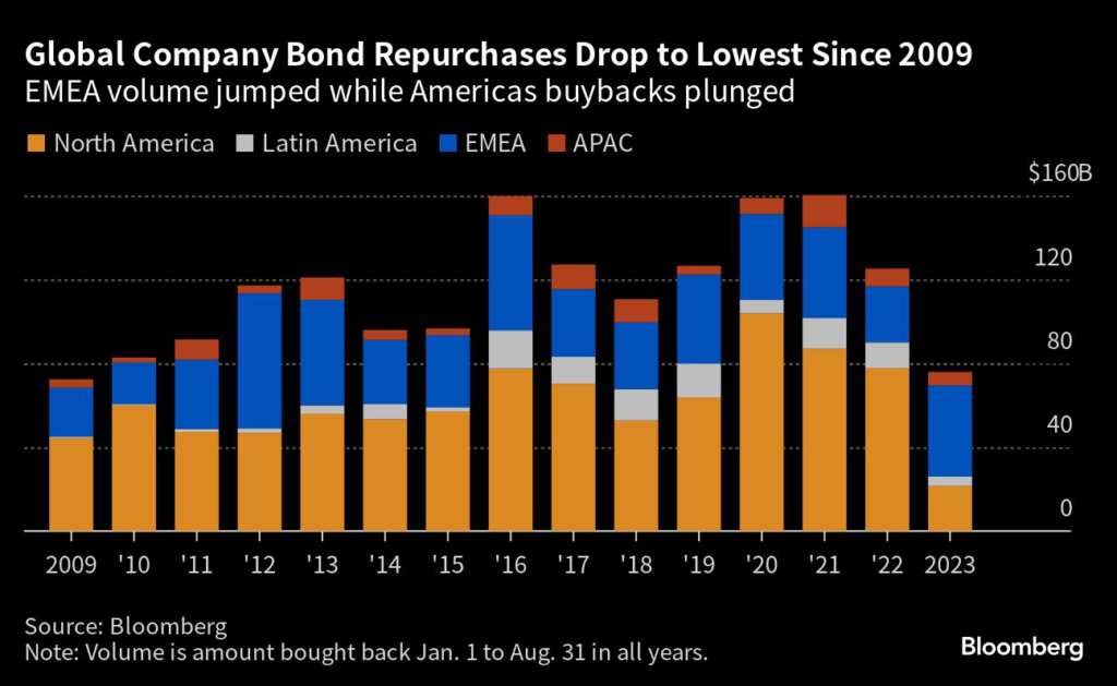 Globally, around $76 billion of corporate bonds have been repurchased so far this year, representing the lowest volume of bonds bought back since 2009, and a 40% drop from this time last year, according to data compiled by Bloomberg though Aug.