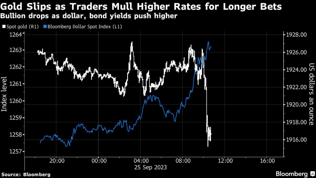 (Bloomberg) — Gold slipped as the dollar rallied and bond yields gained amid speculation that central banks will keep interest rates elevated for longer to rein in inflation.