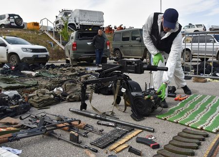 Police also displayed an array of weapons and ammunition they said had been seized, including former Yugoslav army assault rifles, machine guns, sniper rifles, mortars, anti-tank rocket launchers, hand grenades, land mines and drones.