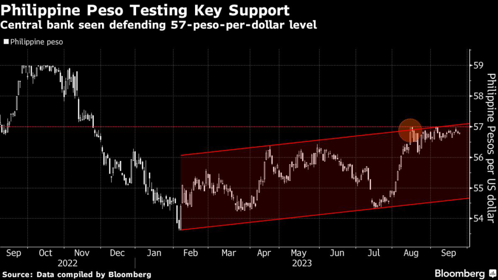 (Bloomberg) — Philippine central bank Governor Eli Remolona signaled officials are intervening to defend the peso at the 57-per-dollar level to prevent the currency from weakening further.