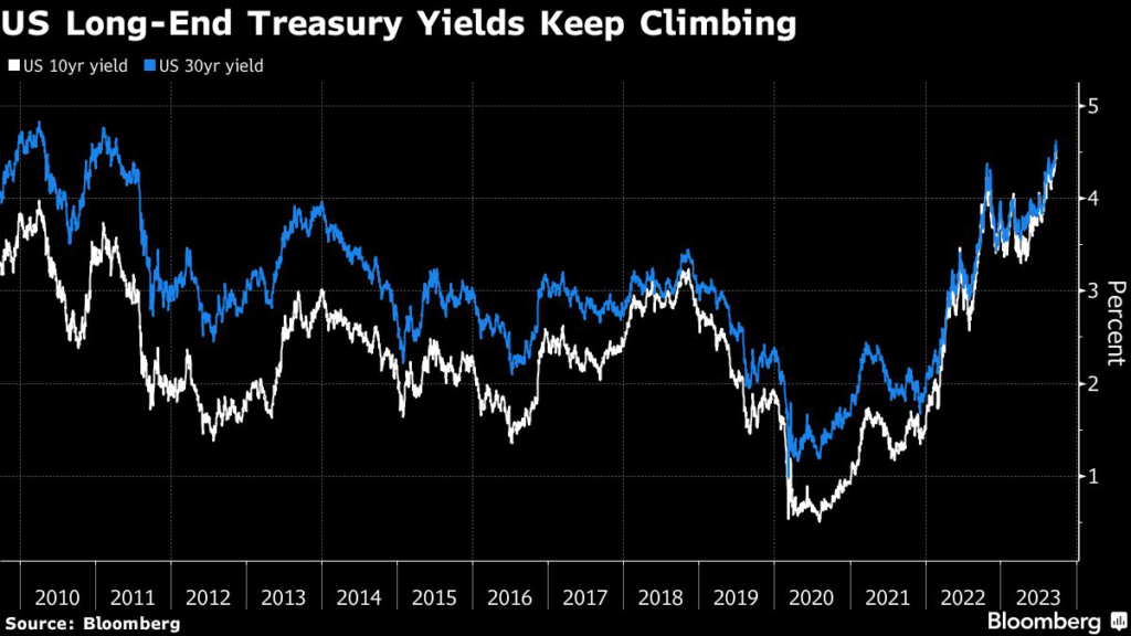 (Bloomberg) — US Treasuries extended their decline, driving 10- and 30-year yields to new multiyear highs, on expectations the Federal Reserve will hold interest rates high and the supply of new bonds will keep rising as the federal government contends with mounting deficits.