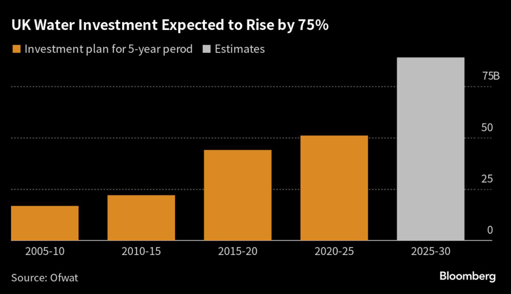 Investment in the 2025-30 period is likely to be about £89 billion ($109 billion), compared with £51 billion in the prior five years, according to Chris Walters, senior director for industry regulator Ofwat’s price review process.