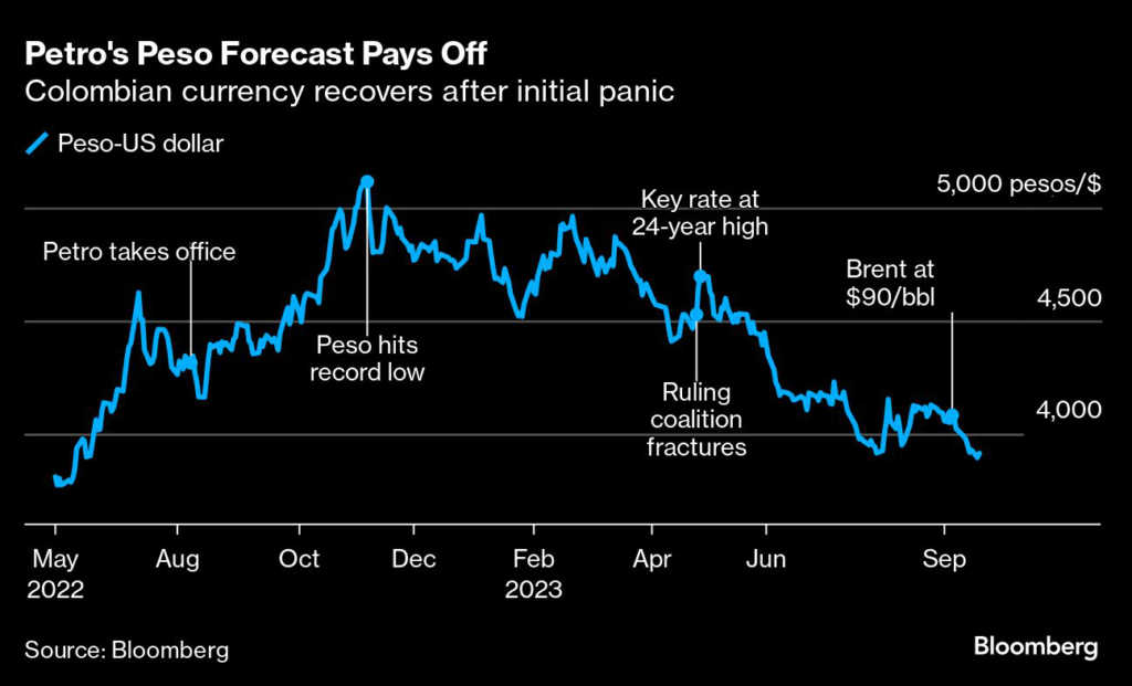 The currency has been buoyed by higher prices for Colombia’s oil exports, which Petro wants to phase out, and one of the world’s highest interest rates, which he is pressuring the central bank to cut.