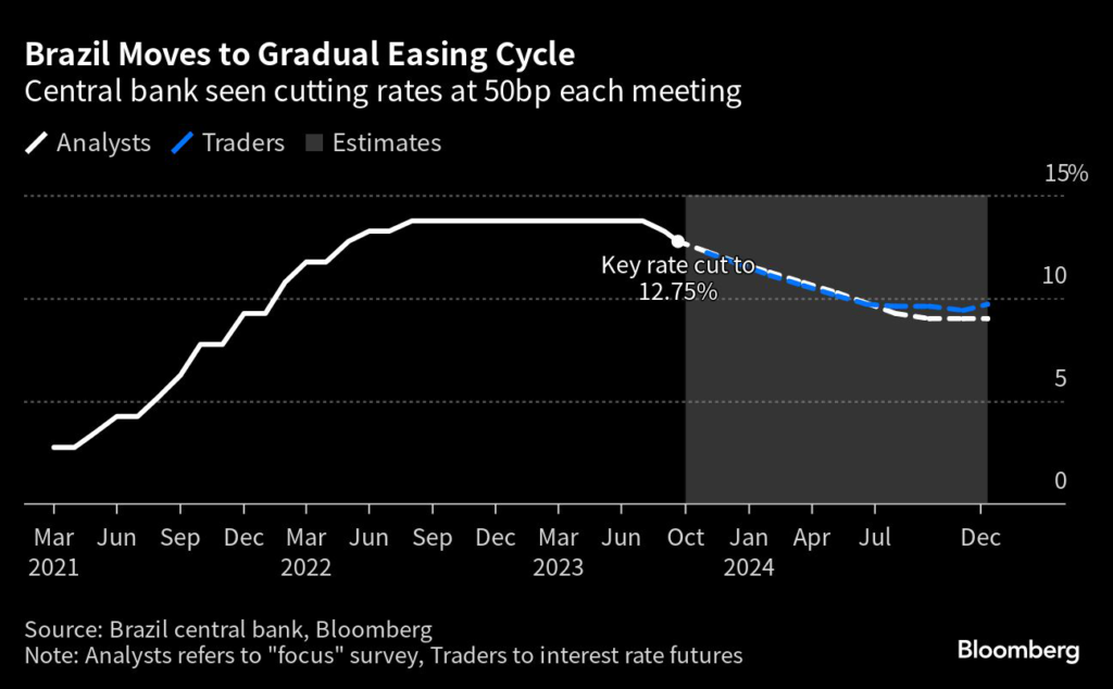 Brazil’s central bank poured cold water on expectations of bigger interest rate cuts, emphasizing risks to the monetary easing cycle it kicked off last month, including above-target inflation expectations that policymakers vowed to bring down.