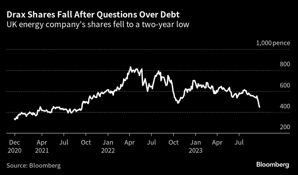 Drax fell as much as 4.7% on Tuesday to the lowest for more than two years after questions surfaced about its debt structure.