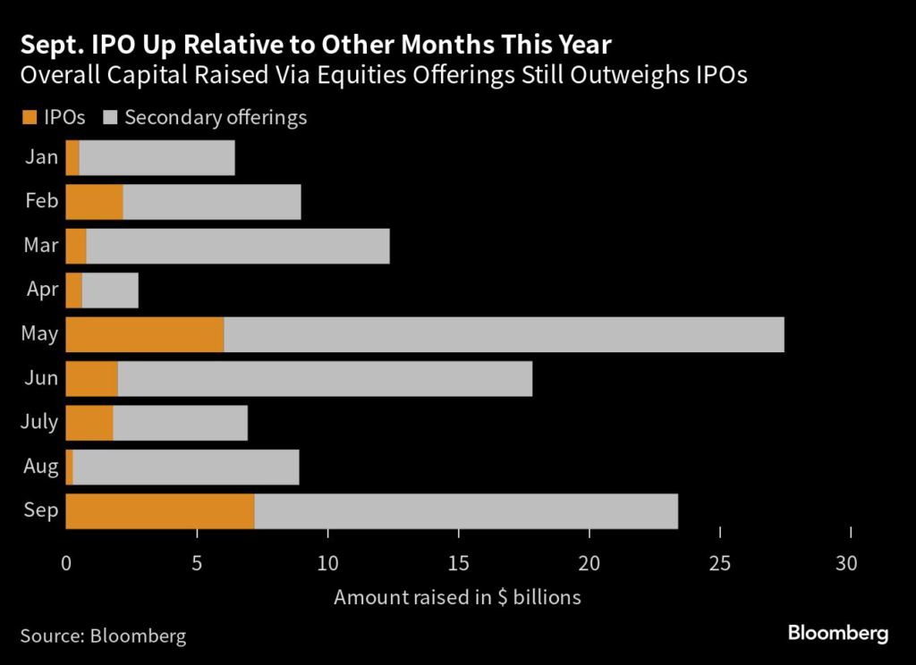 Arm’s mega IPO helped tip that balance back, though the money raised through new listings is still way below the $13.4 billion of secondary share offerings so far this month, Bloomberg data showed.