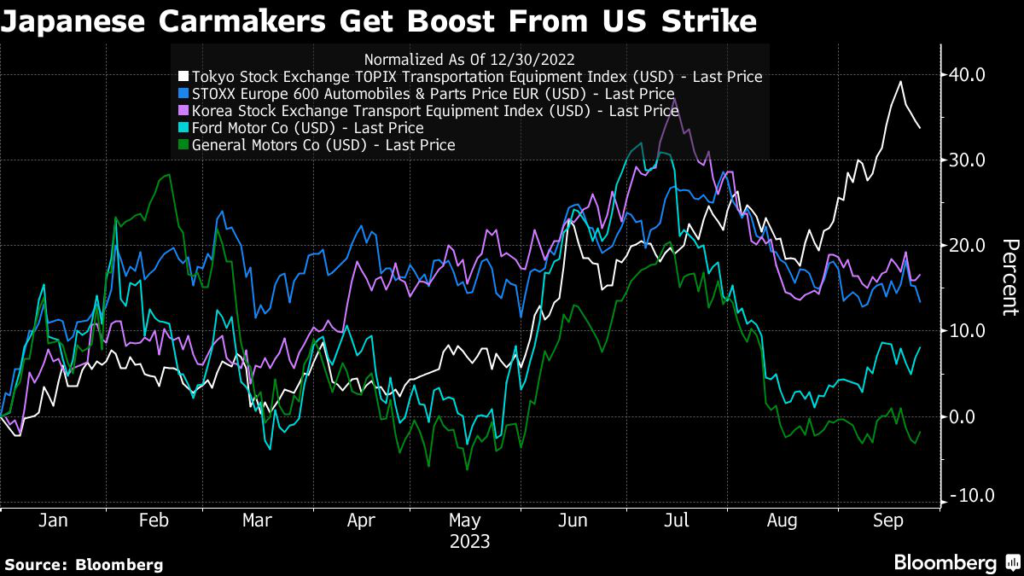 (Bloomberg) — Japanese auto companies look set to be a major beneficiary from the Detroit strike with their US competitors likely to get bogged down in labor negotiations that hurt sales.
